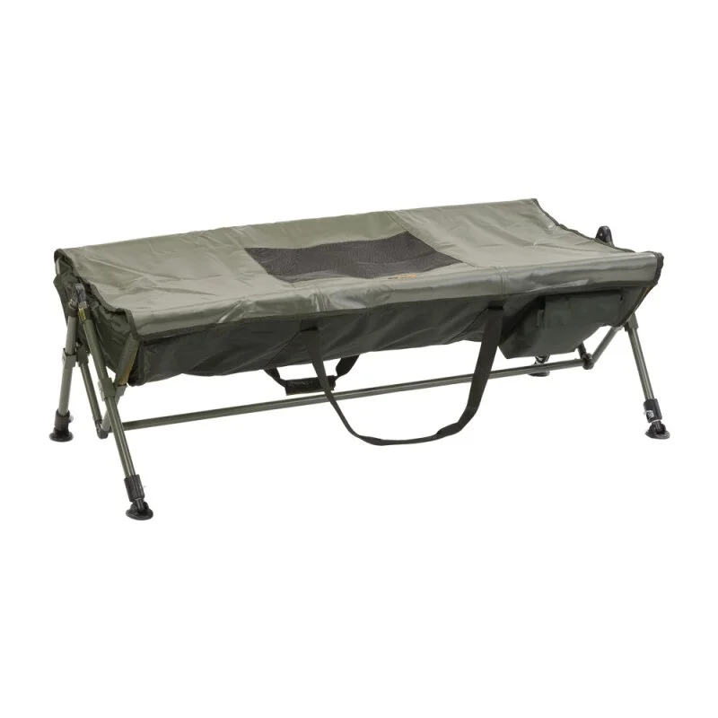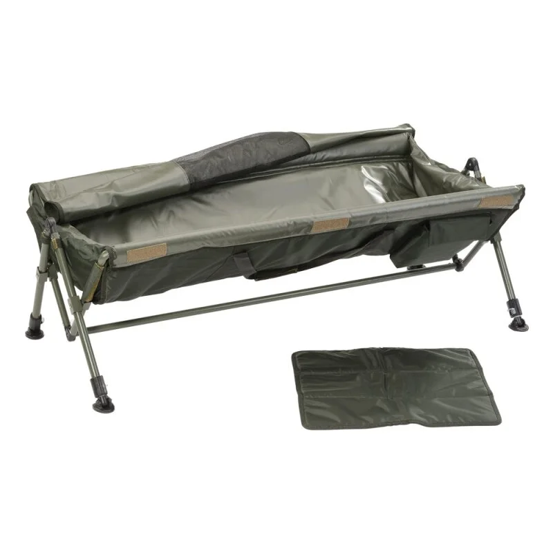 Die „First Class“ Abhakmatte kommt jetzt mit höhenverstellbaren Alubeinen und nochmals breiter! Abhaken, Wiegenvorbereitungen treffen, fotografieren. Alles in einer Multi-Station! Mit Klettverschlüssen versehenen und einer Abdeckplane wird diese Matte 100% ausbruchsicher. In dieser Abhakmatte wurde zur noch schonenderen Behandlung des Fisches kein Wasserablauf eingearbeitet. Der Fisch liegt demnach immer im feuchten Nass. Zum Schutz der Knie beim Fotografieren des Fanges ist eine entsprechende Knieschutzmatte in einer kleinen Tasche, auf der Außenseite der Matte angebracht.