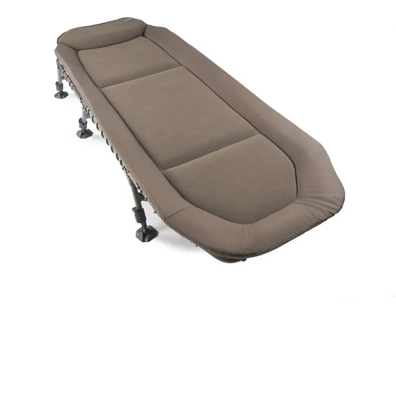 Durch die Kombination eines Rahmens mit aus einer Magnesiumlegierung und einer luxuriösen Memory-Foam Matratze, ist die Benchmark Lite Memory Foam Bed sehr leicht und bequem. Es ist für Angler gedacht, die mit so wenig Gewicht als möglich unterwegs sein wollen, ohne jedoch auf Komfort zu verzichten. Die Handräder wurden bei der Liege weggelassen, um Gewicht zu sparen und eine ebene Fläche für einen erholsamen Schlaf zu schaffen. Die Liege ist schnell aufgebaut und verfügt über extra große, verstärkte Wurfscharniere, die beim Zusammengeklappen einen Winterschlafsack aufnehmen.