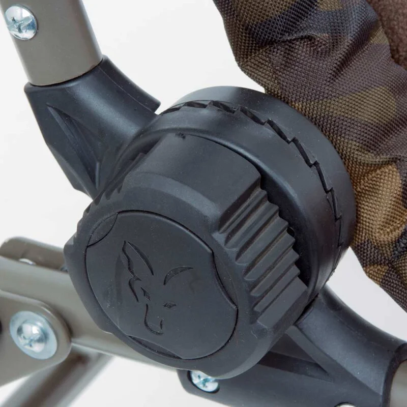 Der mittlere der drei R-Camo-Stühle von Fox verfügt über einen Stahlrahmen, der sich durch Stabilität und Widerstandsfähigkeit auszeichnet. Auf der Sitzfläche und der Rückenlehne sorgt eine hochverdichtete Schaumstoffmatratze mit Mikrofleecebezug für bequemes Sitzen, auch über längere Zeit. Im Kopfbereich der Rückenlehne ist eine extra Polsterung eingearbeitet, die darüber hinaus für Komfort sorgt. Am Rand der Schaumstoffmatratze findet sich eine stabile und pflegeleichte Poyesterumrahmung mit Camouflage-Muster. Durch eine Stellschraube ist die Rückenlehne voll verstellbar, kann also von aufrecht bis liegend in jeder Position festgestellt werden. Die Beine des R2 Camo Chairs sind höhenverstellbar. Dank großer und schwenkbarer Kugelgelenk-Schlammfüße wird ein Einsinken des R2 Camo Chairs auch bei schlammigem Untergrund verhindert. Für zusätzliche Stabilität können die Beine des R2 am Stahlrahmen festgestellt werden. Der R2 Camo Chair verfügt darüber hinaus über mit Neopren abgedeckte Armlehnen, die ihn noch bequemer machen.