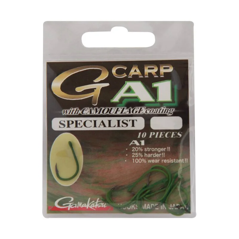 Der Gamakatsu – A1 G-Carp Camou Green Specialist ist ein Öhrhaken, der sich durch sein spezielles Material und seine Teflon-Beschichtung von den meisten anderen Stahlhaken wesentlich unterscheidet. Seine hervorragenden Tarneigenschaften machen ihn zum idealen Haken für moderne Karpfenfischer.