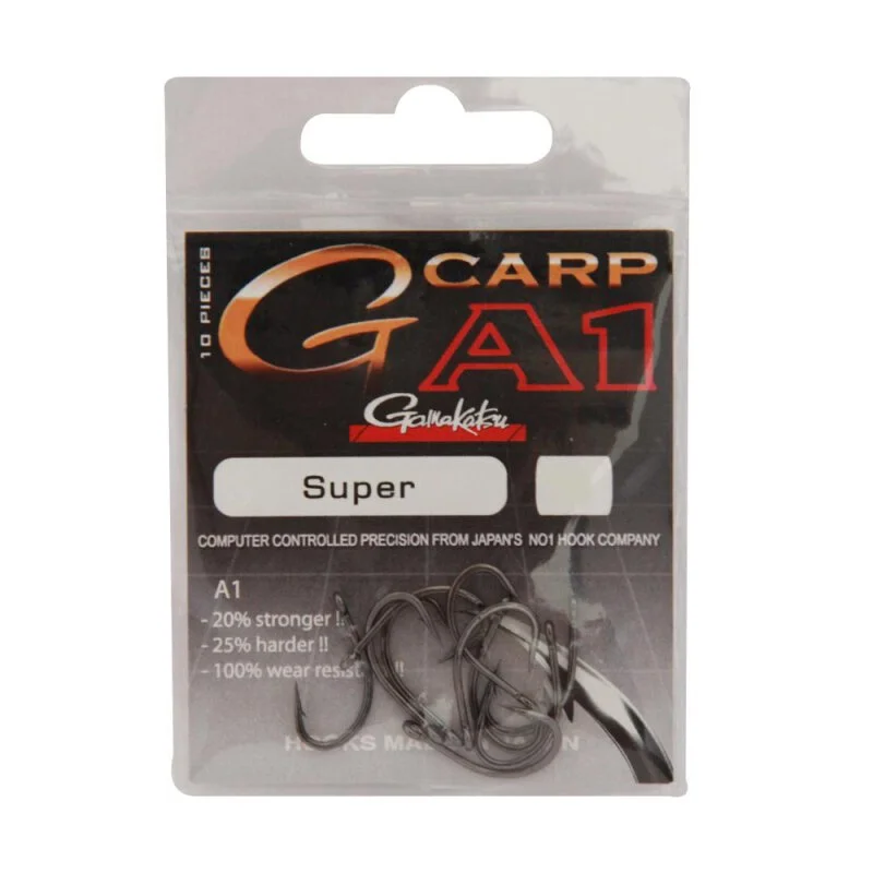 Die High Carbon Haken von Gamakatsu sind nicht nur extrem stark und hart, sondern halten auch doppelt so lange wie herkömmliche Haken aus Stahl. Der Gamakatsu – A1 G-Carp Super Haken verfügt über ein nach innen gerichtete Hakenspitze. Er eignet sich insbesondere für alle Montagen mit Schrumpfschlauch. Der Gamakatsu Einzelhaken ist in verschiedenen Größen erhältlich. In einer Verpackung sind 10 Haken, sodass eine Packung für viele Sessions reicht.