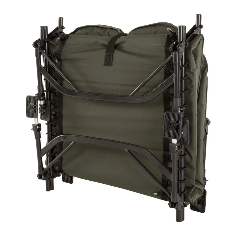 - Doppelgelenksystem für ein flaches Bett. Im gefaltetem Zustand ist beim Transport Platz für einen befestigten Schlafsack