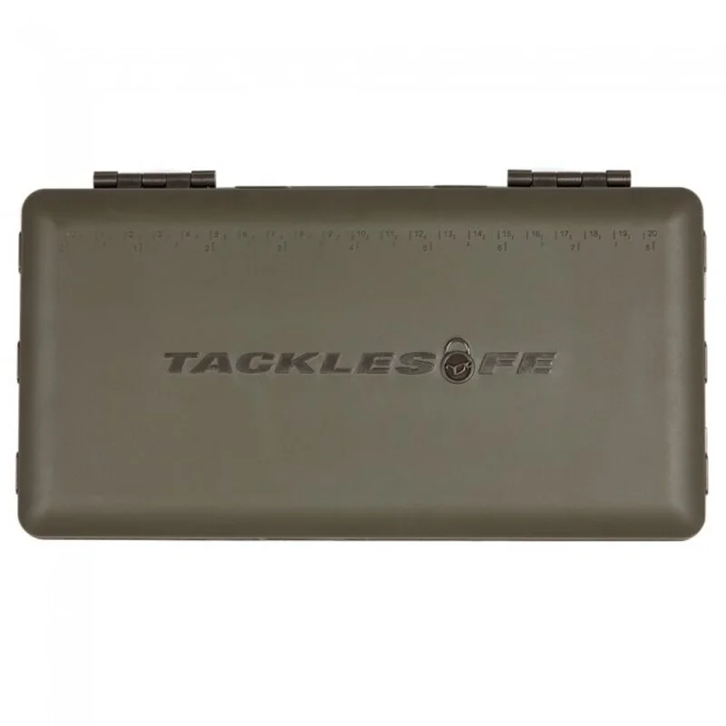 Der TackleSafe ist ein kompaktes Endtackle-Aufbewahrungssystem in einem harten, klappbaren Etui, das magnetisch gesichert ist und eine griffige, rutschfeste Außenbeschichtung sowie ein Lineal aufweist, mit dem Sie Ihr Rig leichter binden können. Auf einer Seite befindet sich ein offenes Fach, in das größere Gegenstände wie Spulen mit Vorfachmaterial, Pulla Rig Toolz und Scheren eingelegt werden können. Die gleiche Hälfte des TackleSafe verfügt auch über acht Fächer, auf die über Klappdeckel zugegriffen werden kann, um sicherzustellen, dass die darin enthaltenen Gegenstände nicht versehentlich herausfallen – es ist perfekt für Dinge wie Heli-Safe-Perlen, Hybrid-Blei-Clips und Fake Baits. Die andere Seite des TackleSafe hat zwei größere Fächer mit Deckeln, in denen Hakenpakete und Ködernadeln aufbewahrt werden können. Es verfügt auch über eine Reihe kleinerer, flacher Fächer mit Deckel, in denen Wirbel, Schrumpfschläuche, Rig-Ringe, Kickers und andere kleinere Teile aufbewahrt werden können.