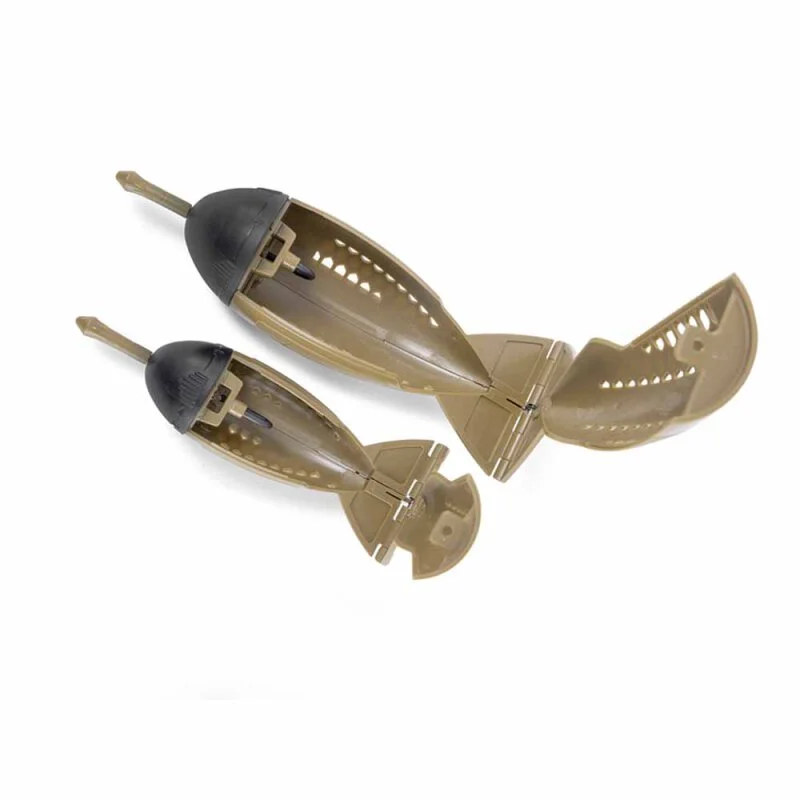 Der Füllraum besteht aus zwei Teilen, die durch Federkraft geöffnet werden, wenn der Bopper auf dem See- oder Flussgrund auftrifft. Der Stift aus rostfreiem Stahl drückt im Inneren des Körpers nach oben, um die Klappe zu öffnen und das Futter auszuladen. Der Körper selbst ist mit Löchern versehen, um das Einholen in schnell fließendem Wasser zu erleichtern. Das Befüllen mit Futter und Ködern ist einfach, und aufgrund der Form der Hauptkammer passt viel mehr Futter hinein als bei selbstgebauten Alternativen. Es gibt zwei Größen des Boppers, um unterschiedlichen Anforderungen gerecht zu werden, und jede Version kann bei Bedarf mit oder ohne Zusatzgewichten im Inneren verwendet werden. Die Möglichkeit, den Bopper zu beschweren, wenn Strömung oder Tiefe es erfordern, ist ein entscheidender Vorteil und wird sicher viele Fluss- und Feederanglern auf der ganzen Welt begeistern.