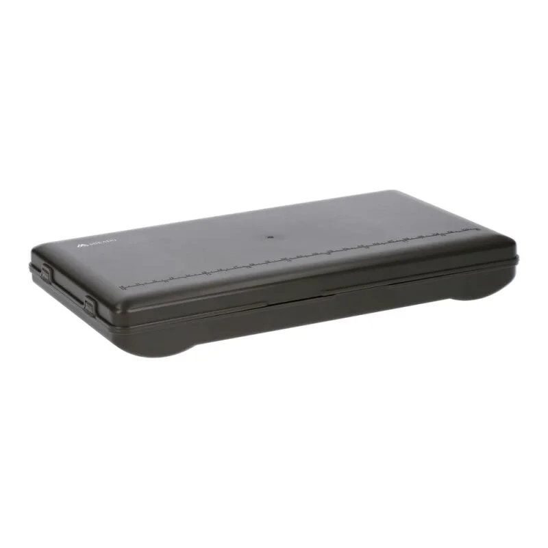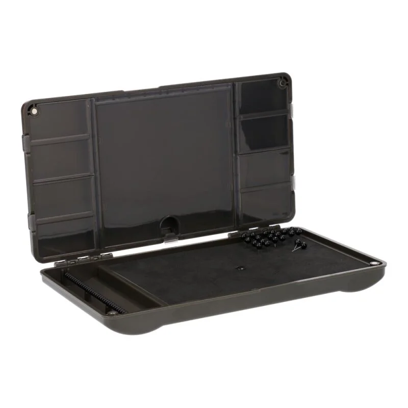 Eine professionelle Karpfenangelbox mit einem System aus Fächern und Magneten. Ausgestattet mit zusätzlichem Schaumstoff und Stiften für gebundene Rigs und mit einer ganzen Reihe kleinerer Fächer für das beim Angeln unentbehrliche Zubehör.