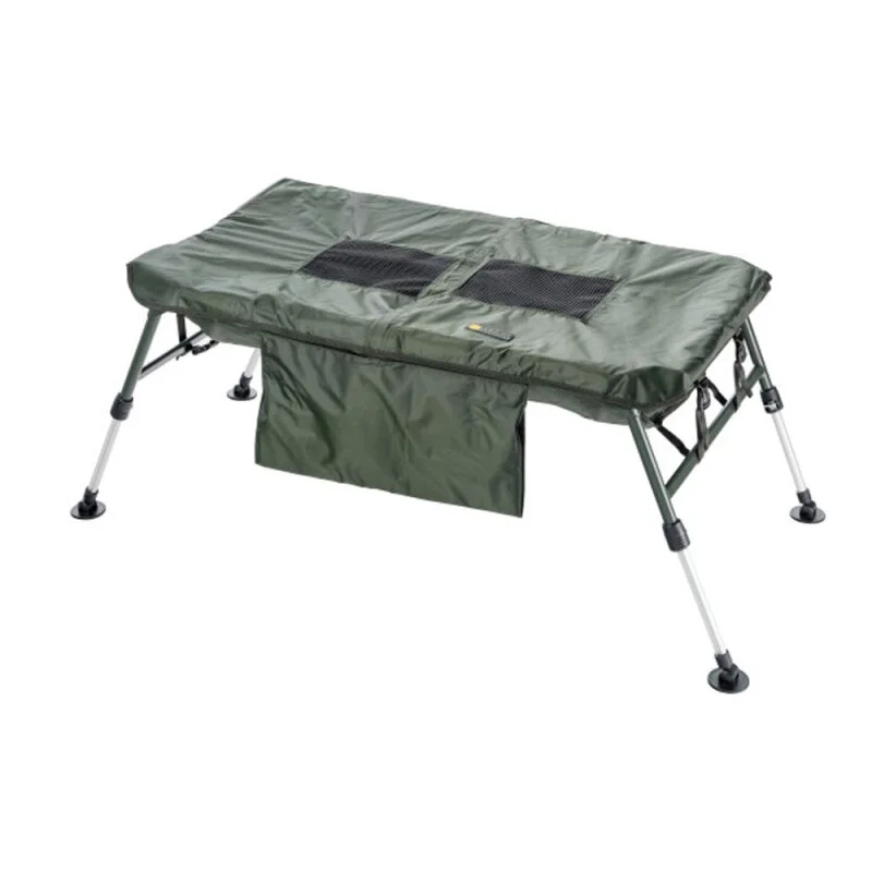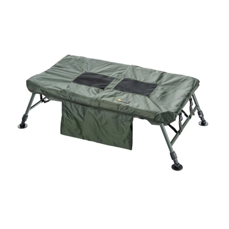 Eine kompromisslose Lösung wenn es darum geht mit dem Fang behutsam umzugehen. Diese geräumige Cradle, mit ihrem sehr starken Rohrrahmen und vier unabhängig verstellbaren Beinen, sorgt für einen sicheren und festen Stand auf nahezu jedem Gelände. Die genial gestaltete Abdeckung ermöglicht ein vollständiges Verschließen der Wiege, während man trotzdem die Möglichkeit hat, zusätzliches Wasser durch die Abdeckung zu schütten. Denn es wurden 2 gummierte Fensteröffnungen eingearbeitet. Das Wasser tritt durch zwei Maschenbereiche auf beiden Seiten der Wiege aus. Zusätzlich ist die Cradle mit einer gepolsterten Matte ausgestattet auf der es sich bequem knien lässt,