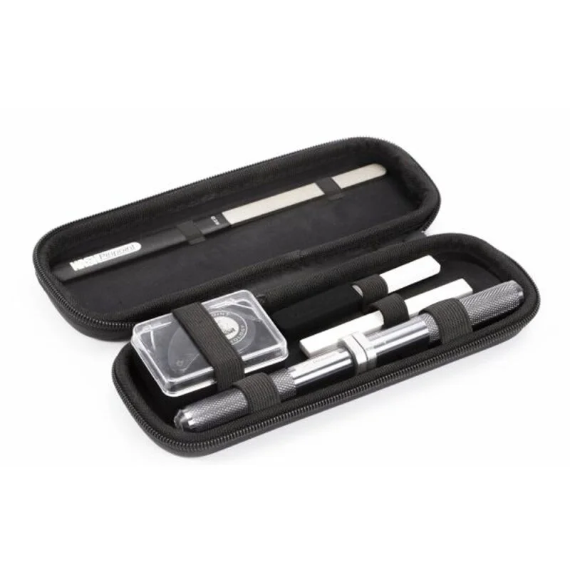 Das Precision Sharpening Kit beinhaltet jegliche Nash Pinpoint Hardware die man braucht, um selbst nadelscharfe Haken herzustellen. Alle Utensilien sind in einer mit Reißverschluss verschließbaren EVA Tasche mit elastischen Schlaufen befestigt.