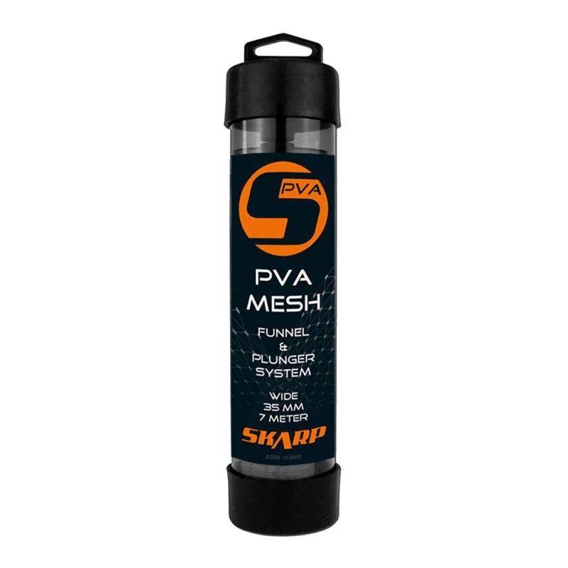 Mit dem Skarp PVA Mesh Funnel & Plunger System lassen sich im Handumdrehen kleine PVA Säckchen für ein punktgenaues Anfüttern auf weite Entfernungen herstellen. Die Lieferung erfolgt auf einer Tube (Kunststoffröhre) in einer verschlossenen Kunststoffdose. Die Tube dient nicht nur zur aufbewahrung des Netzes, sondern auch als Einführhilfe des Futters.