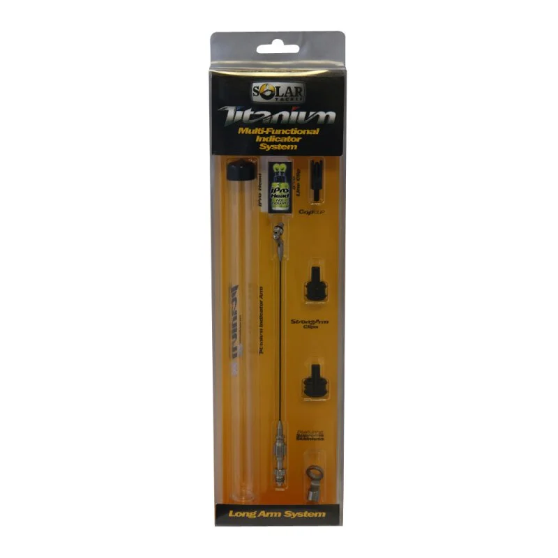 Das, in Großbritannien entwickelte, Titantium Indicator System gehört zu den universellsten, optischen Bissanzeiger Systemen des Markts. Dank des präzise gefertigten Systems können alle Situationen eines Karpfenanglers abgedeckt werden. Innerhalb von Sekunden kann das Titanium System auf die jeweilige Situation eingestellt werden. – Egal, ob Slack oder Tight Line oder aber Long Range Style – Das Bissanzeiger-System eignet sich für alle. Der Arm kann auf frei schwingend sowie auf Spannung mit Hilfe des Gewindes gestellt werden. Ein weiteres Feature ist das extrem flexible und dennoch enorm stabile Material aus Aero-Space Metall. Dank des doppelten Chain-Link Gelenks wird für Sensitivität gesorgt und der Indicator Kopf kann immer im 90° Winkel zur Schnur stehen. Abgerundet kann man den Solar Tackle Titanium als wohl einer der Besten Bissanzeiger System überhaupt sehen.